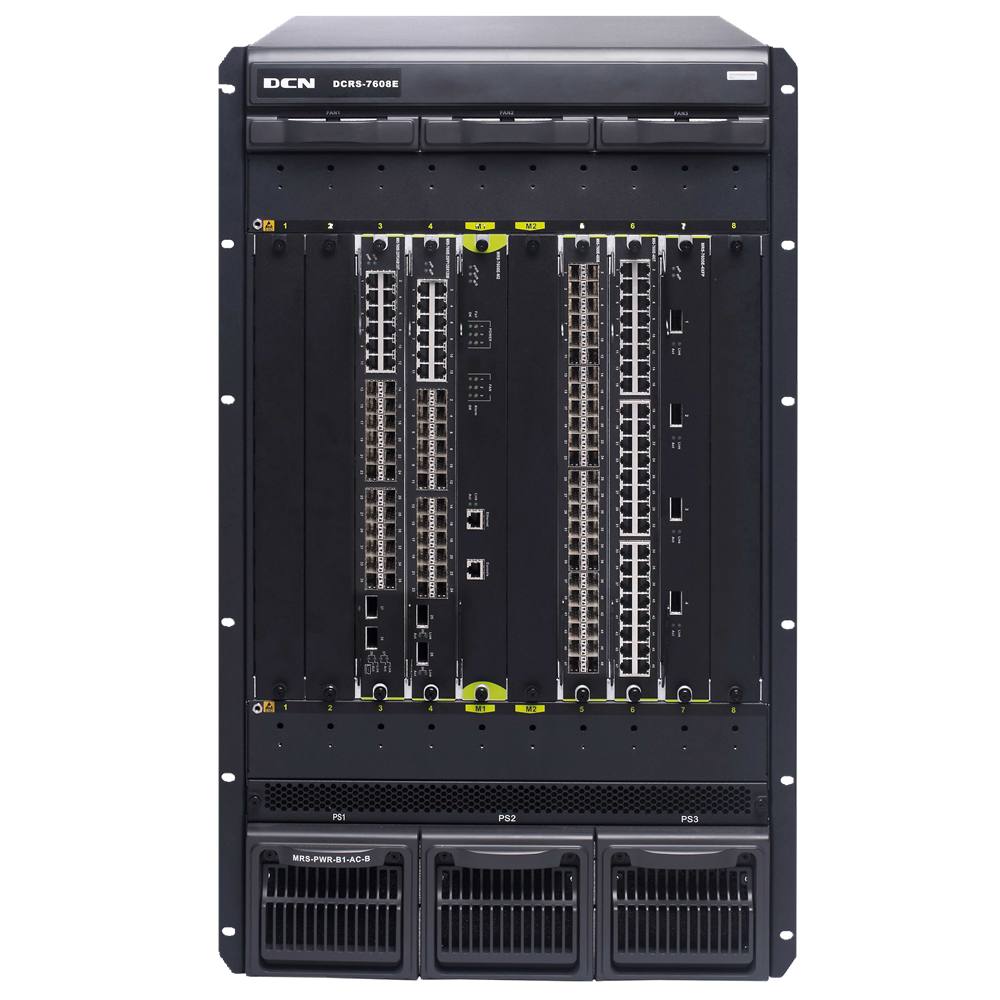 DCRS-7608E DCRS-7608E(R3.0)机箱式路由交换机主机(8个业务插槽,2个管理引擎插槽,研讨电源2+1冗余),标配1个MRS-PWR-AC-B研讨电源,满配风扇盘,不含管理引擎模块